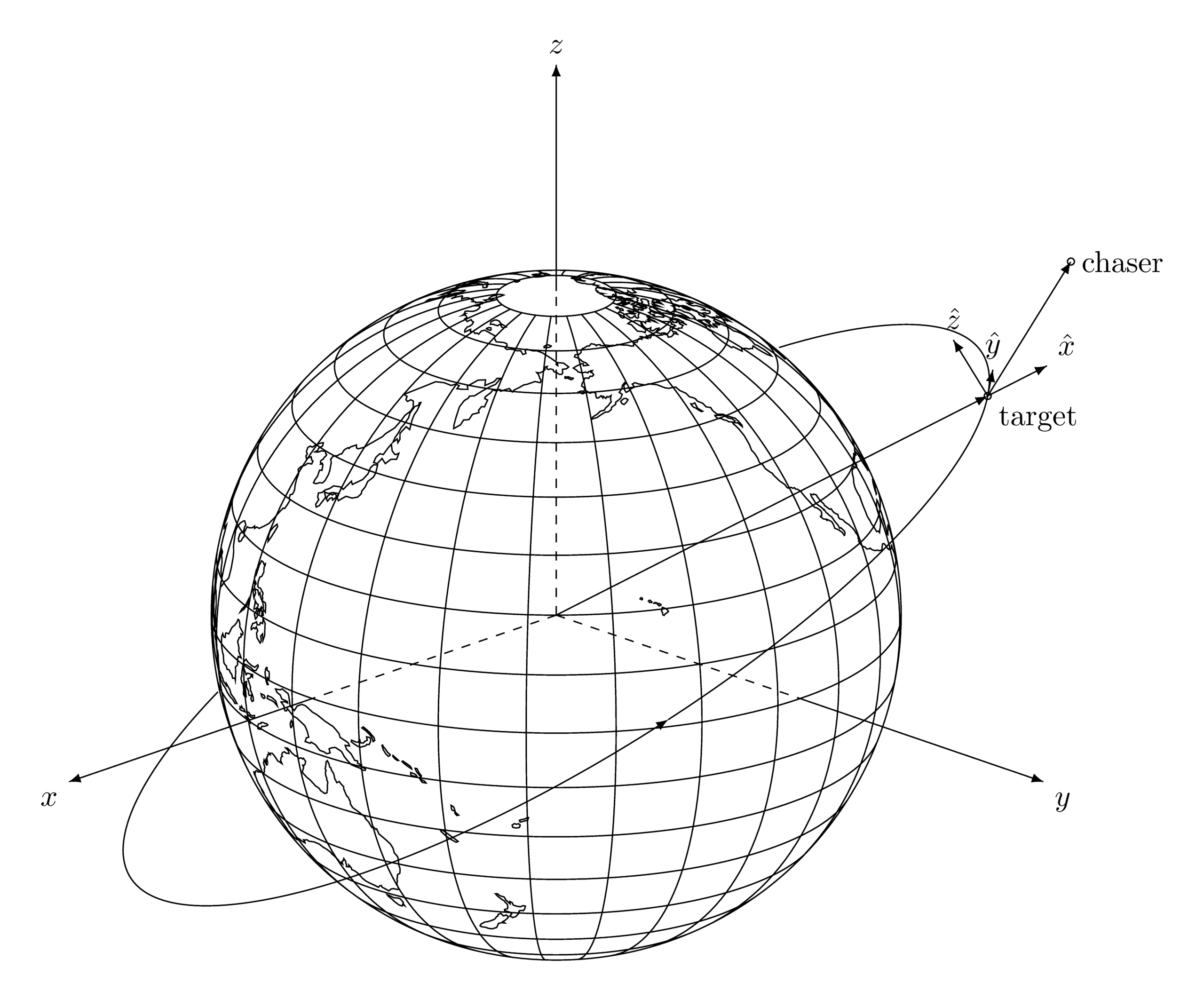 宇宙機(人工衛星や宇宙船)を他の宇宙機に対して接近させることを,ランデブー(Rendezvous)といい,ランデブーの目標物体をターゲット(Target),ランデブーを行う物体をチェイサー(Chaser)と呼びます.ヒルの方程式は,円軌道上を周回するターゲットに対してその近傍にあるチェイサーの運動を表す方程式です.ヒルの方程式は次のように表されます.